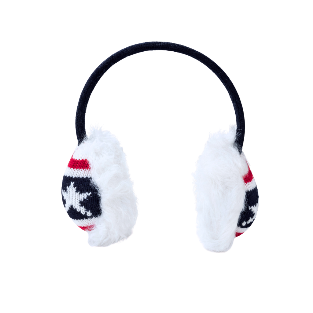 • Design: Features plush white earmuffs with American flag accents in red, white, and blue. The soft fuzzy texture and patriotic pattern give them a cozy and eye-catching winter look.