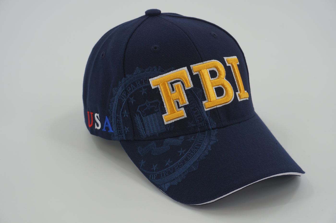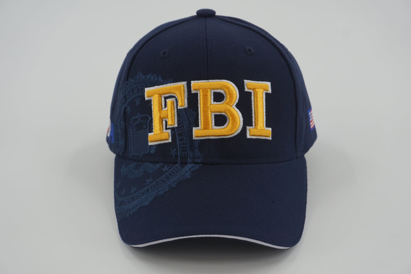 • Subtle FBI seal printed behind the lettering, blending into the navy fabric