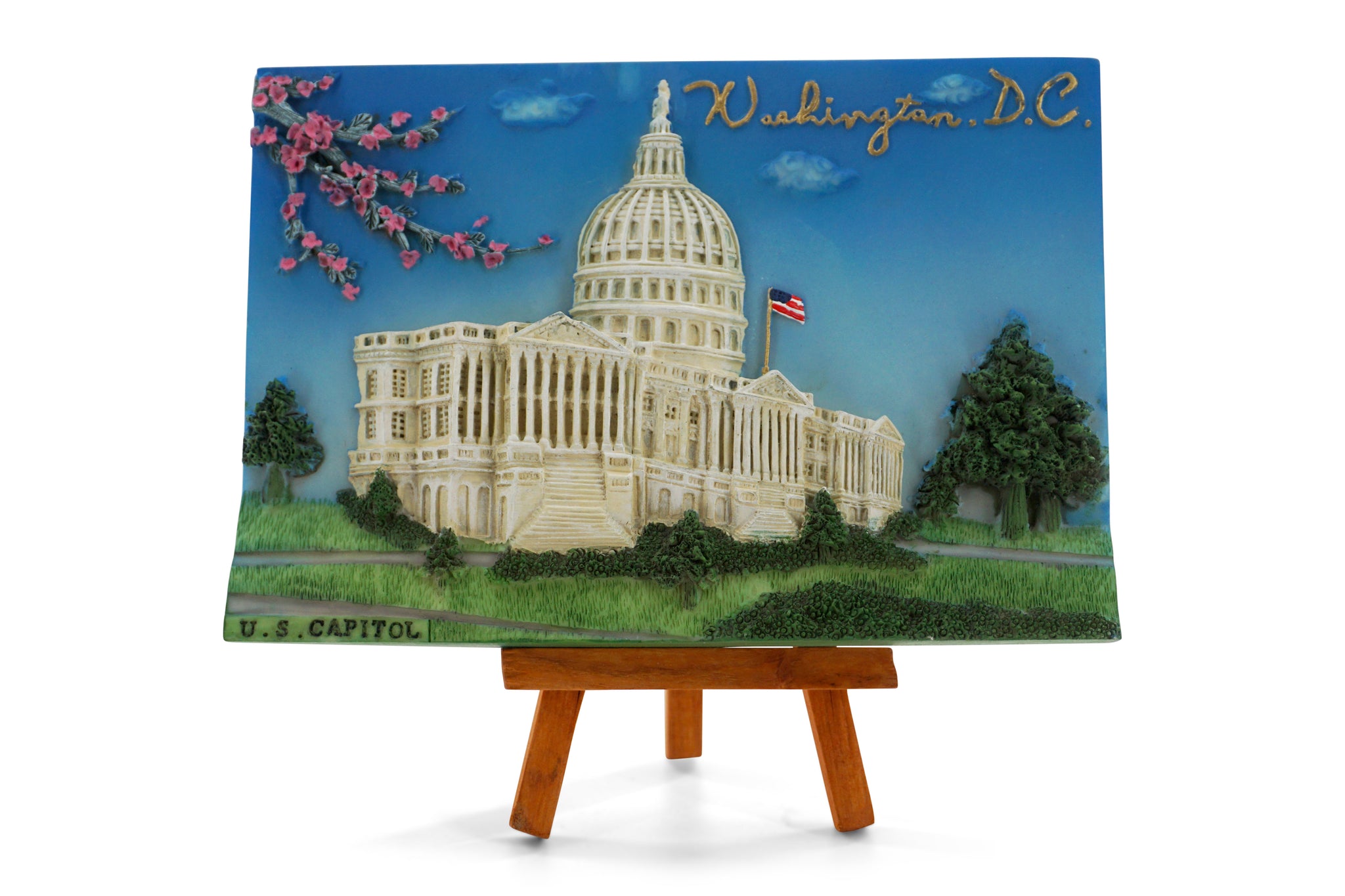 Bring home a classic piece of Washington, D.C. with this square display model featuring the U.S. Capitol at the center. Surrounded by lush green trees, grass, and blooming cherry blossoms, the design captures the beauty of the real landmark under a bright blue sky. The model comes with its own stand, making it easy to showcase anywhere.