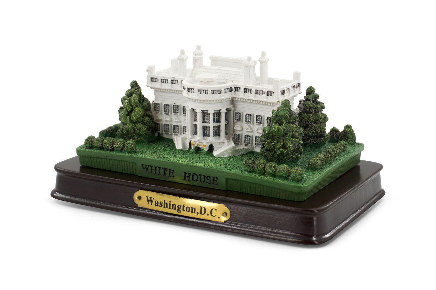 The model is securely mounted on a rich, dark wood-style base with a gold-tone nameplate that reads “Washington, D.C.”, and the lawn in front is subtly engraved with “WHITE HOUSE”. It’s a timeless keepsake that adds patriotic charm to any home, office, or gift collection.