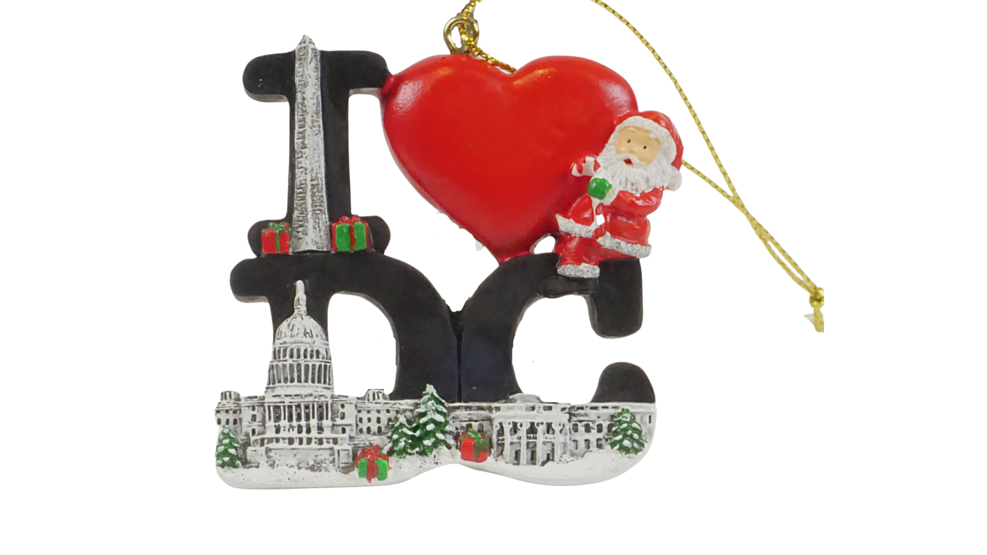 Celebrate the holidays with a festive twist on a classic D.C. design! This black ornament features a bright red heart, with the Capitol perched atop the “D” and the White House accenting the “C.” Adding a playful holiday touch, Santa hangs from the heart, making it a fun and unique decoration for your tree or collection.