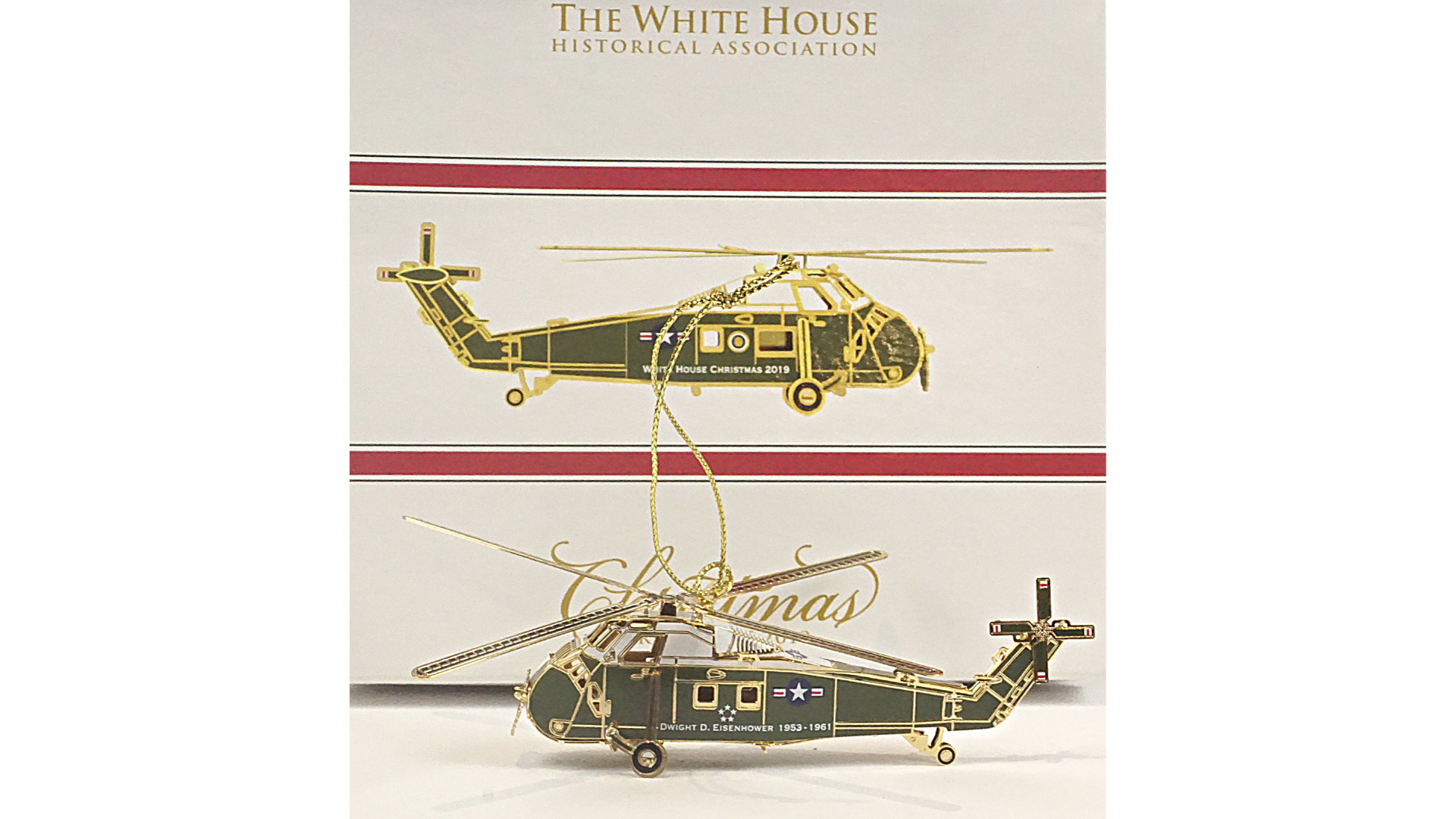 Celebrate innovation, presidential history, and holiday spirit with this exquisite ornament honoring Dwight D. Eisenhower, the 34th President of the United States. This design features a detailed replica of the presidential helicopter — symbolizing the first time a sitting president flew by helicopter in 1957.