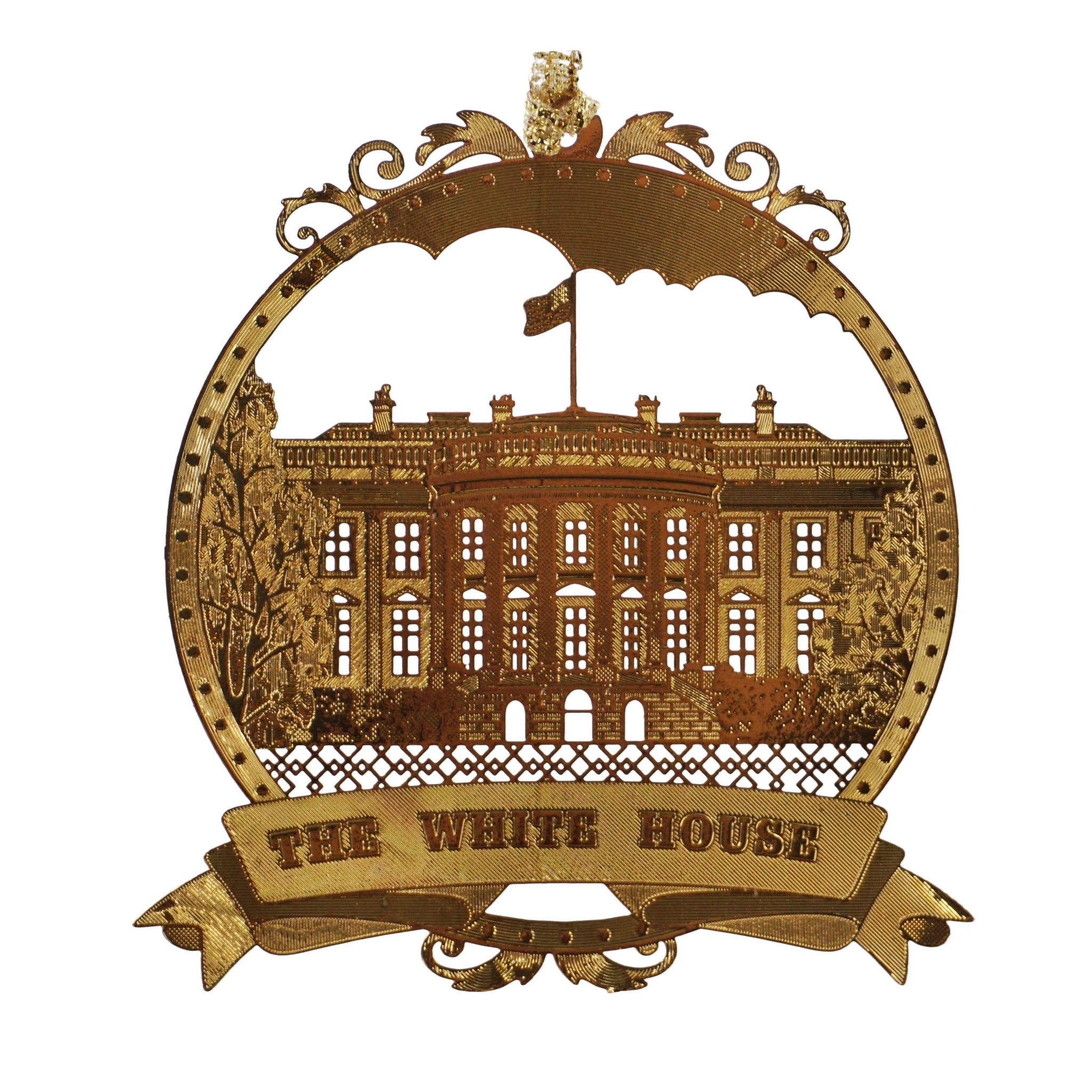Celebrate the iconic residence of the President with our exquisite gold metal ornament featuring a detailed panorama of the White House. This elegant piece is perfect for adding a touch of sophistication to your holiday decor or as a unique gift for history buffs.
