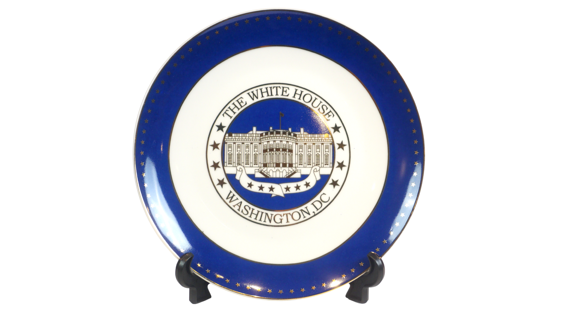 This blue and white porcelain plate showcases a finely detailed illustration of the White House at the center. The words “White House” and “Washington, D.C.” are elegantly inscribed in gold, with four stars placed on either side, completing the design. This striking piece is a tribute to one of America’s most recognizable buildings.