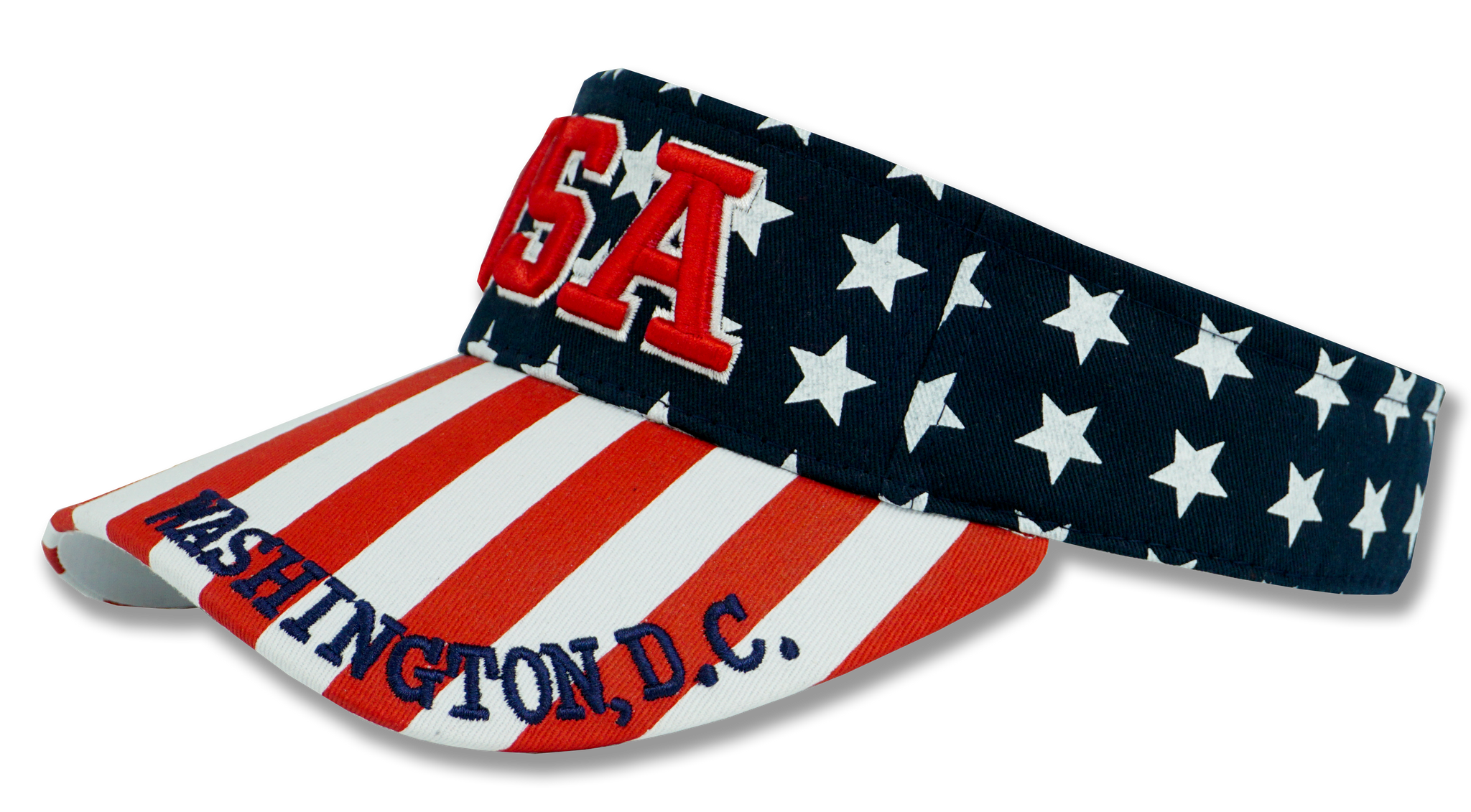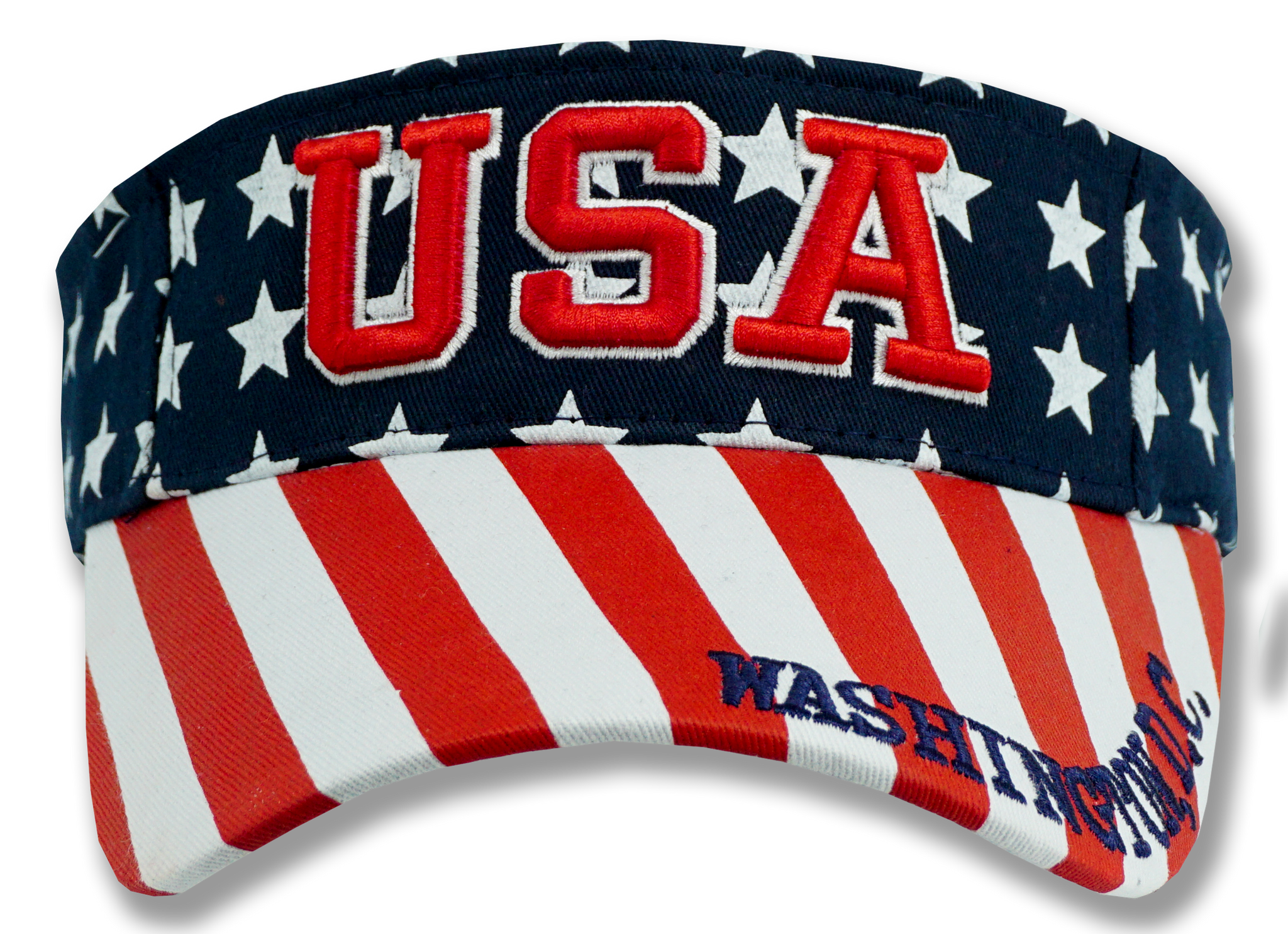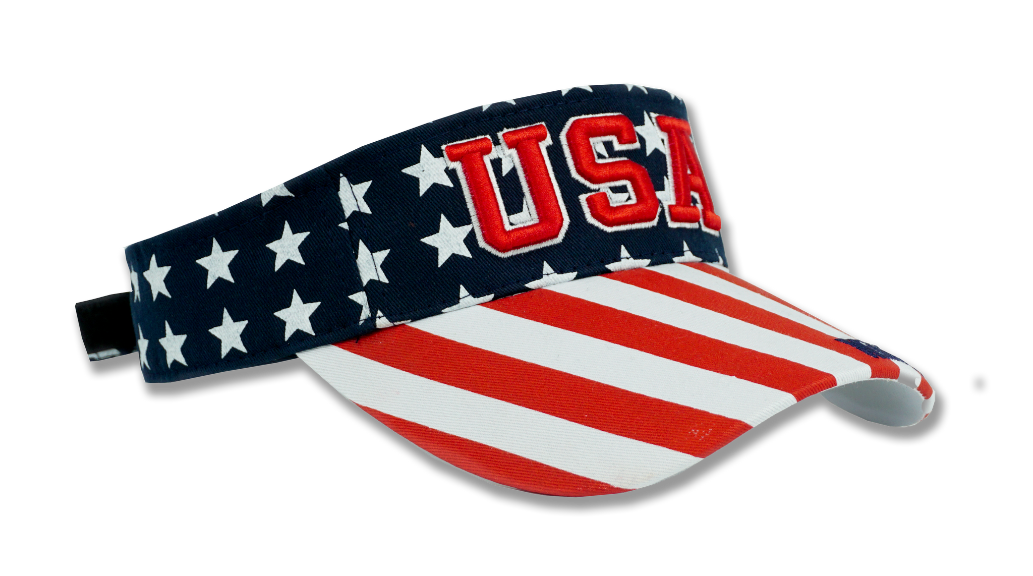 - Unisex embroidered USA visor with stars and stripes graphic.