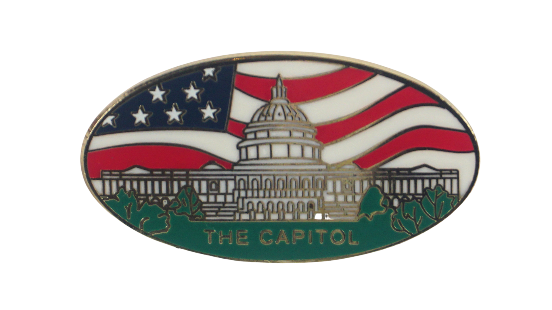 This stunning pin features the U.S. Capitol as the centerpiece, set against the backdrop of the American flag. With green grass at the bottom, it highlights the iconic architecture of the Capitol and is framed with "Washington, D.C." written in gold for an elegant touch. A perfect way to show your pride for the nation's capital.