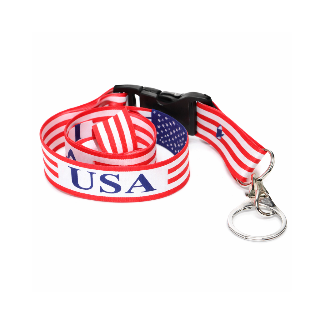 Introducing our patriotic lanyard featuring bold "USA" lettering alongside the iconic stripes of the American flag. This vibrant lanyard showcases the classic red, white, and blue colors, making it a perfect accessory for events, gatherings, or everyday use.