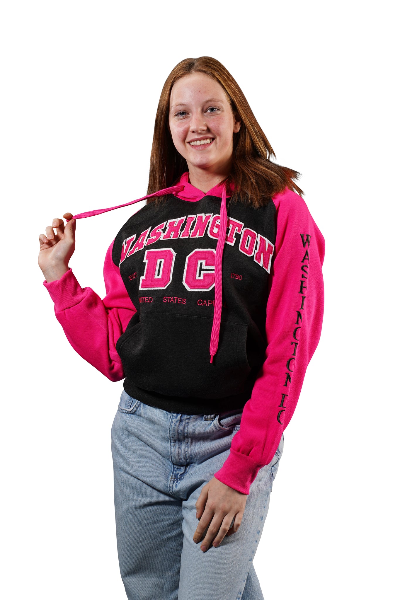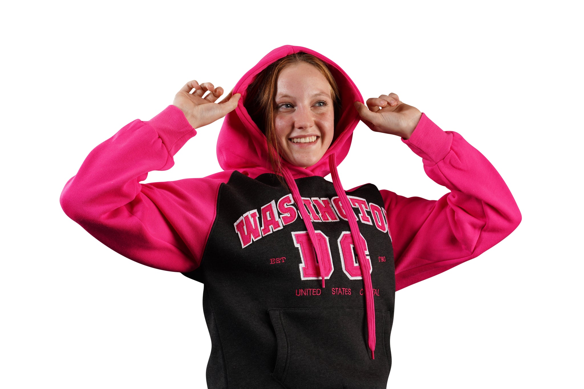 Elevate your casual style with our eye-catching two-tone hoodies. The bold text highlights “Washington DC,” creating a clear tribute to the nation’s capital.Available in three different colors.