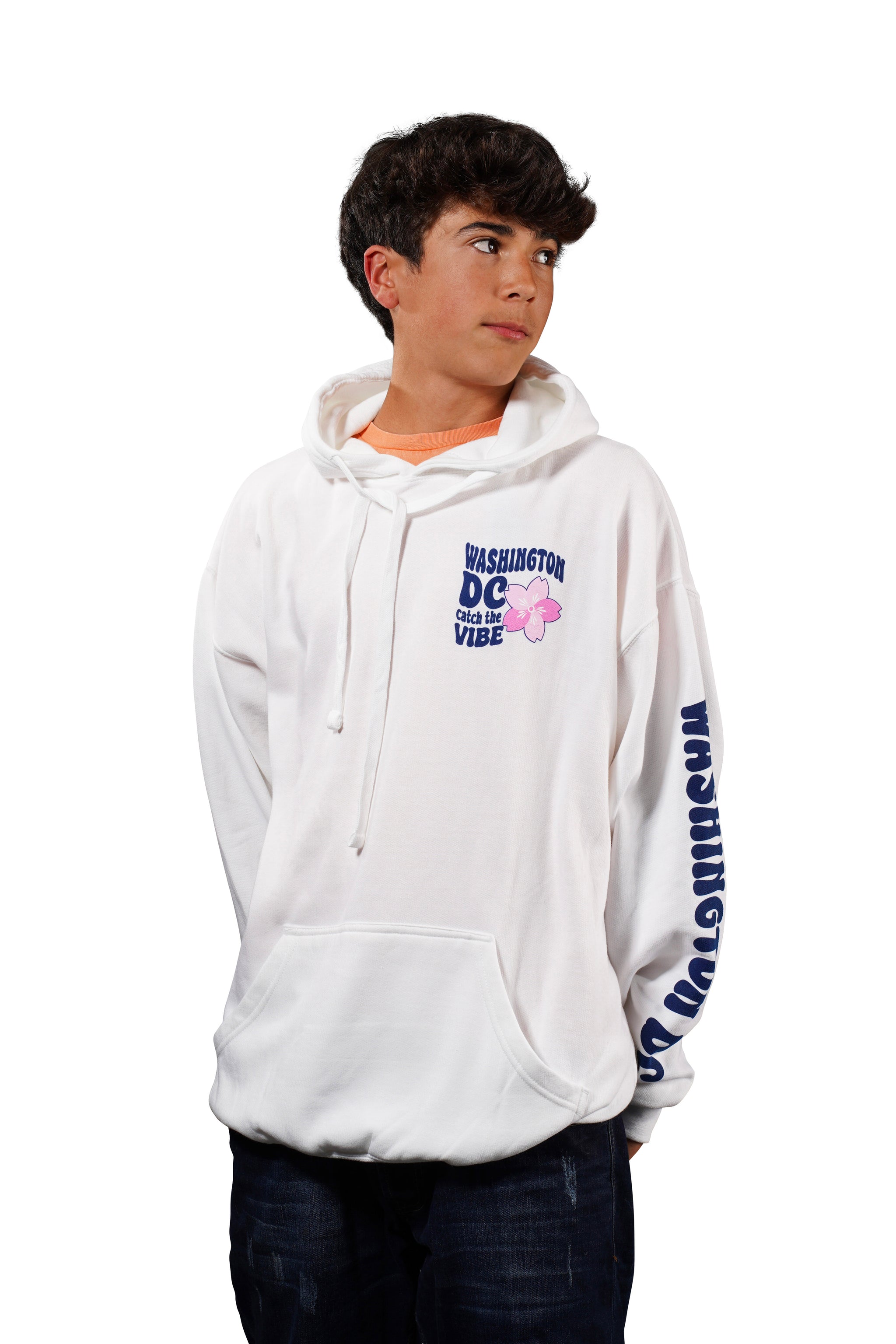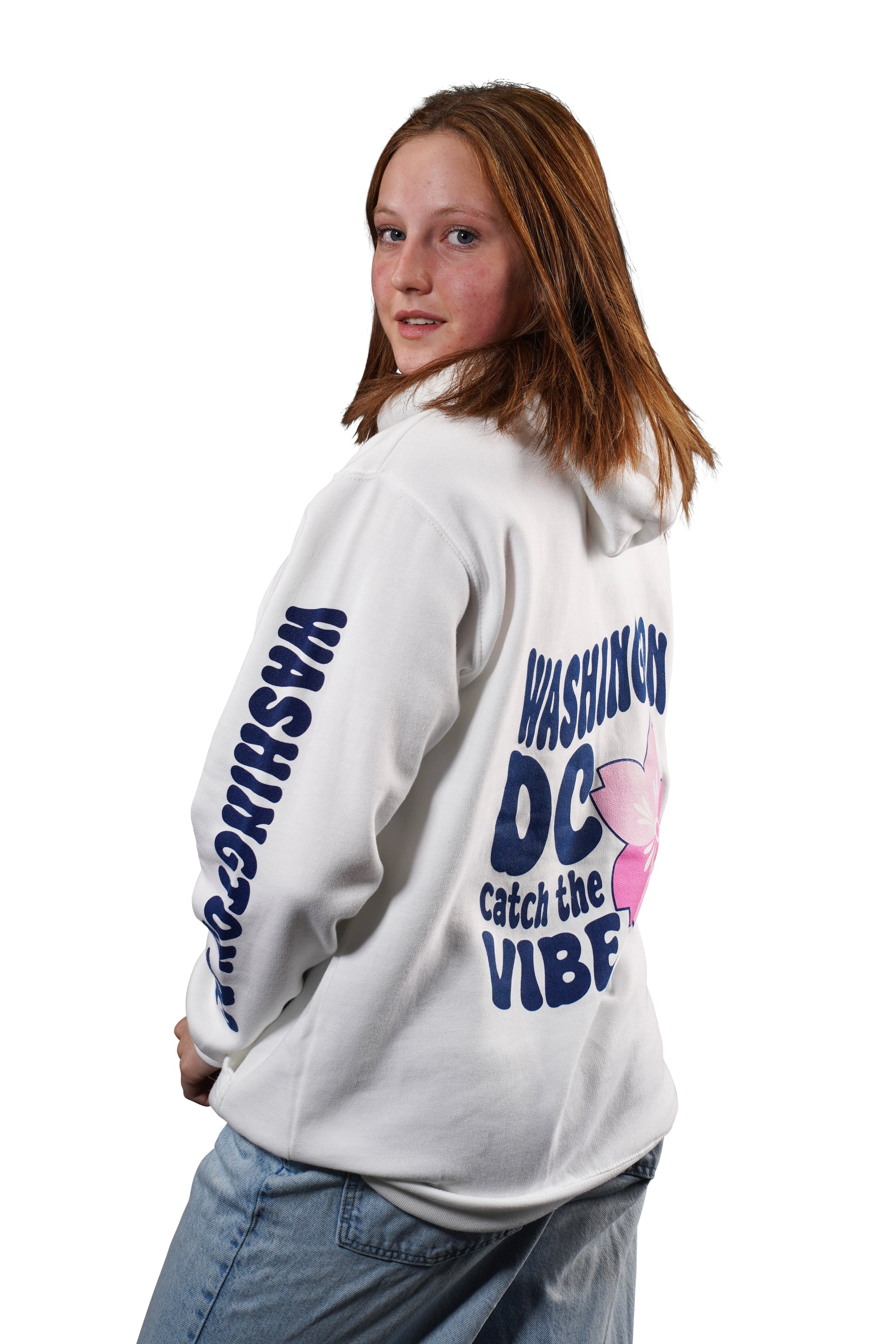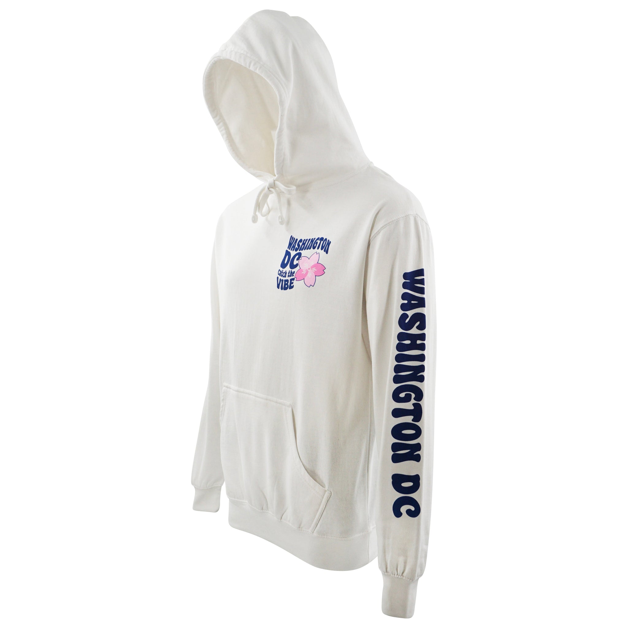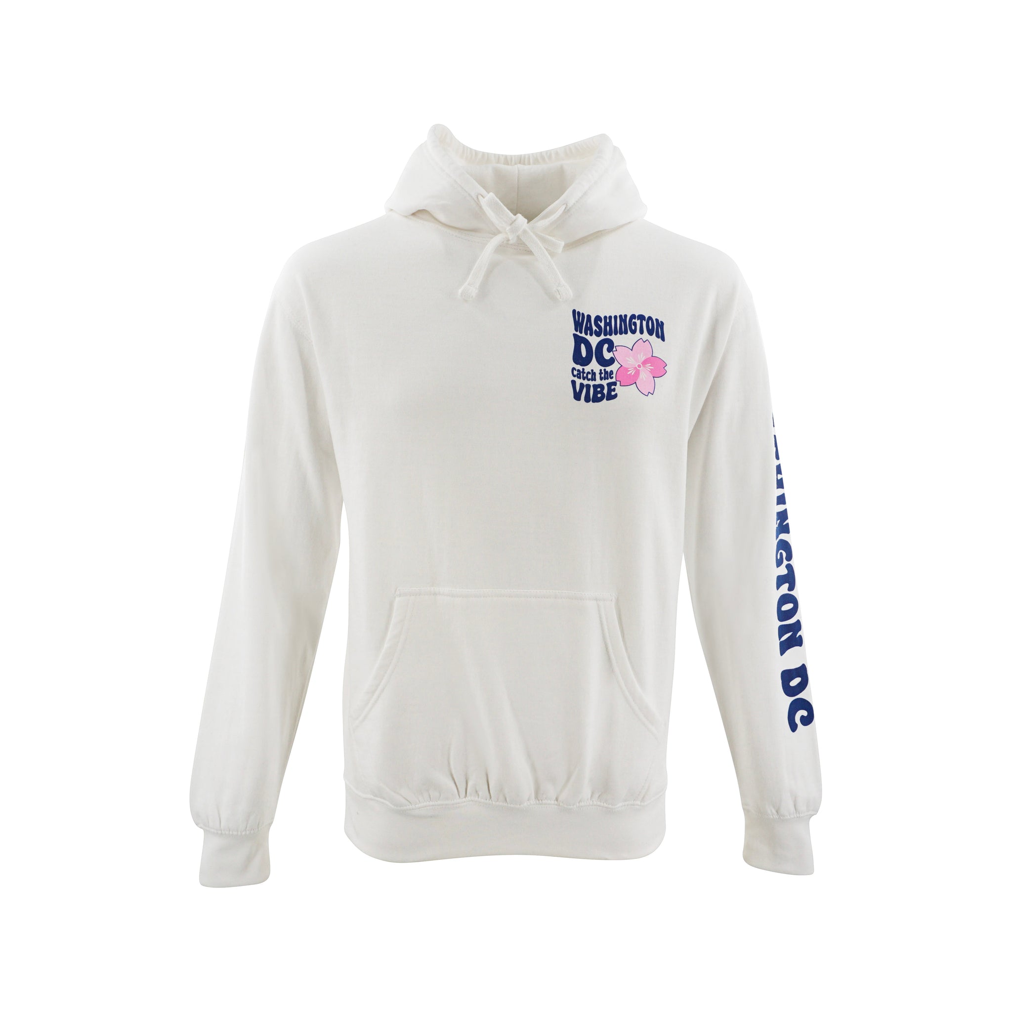 Express your unique style with our vibrant and cozy Vibes hoodie! Designed to embody the spirit of Washington, DC, featuring the playful text "Washington DC Catch the Vibe" on the front, accompanied by a charming pink cherry blossom flower, this hoodie is perfect for those who embrace both style and comfort. Available in four different colors.
