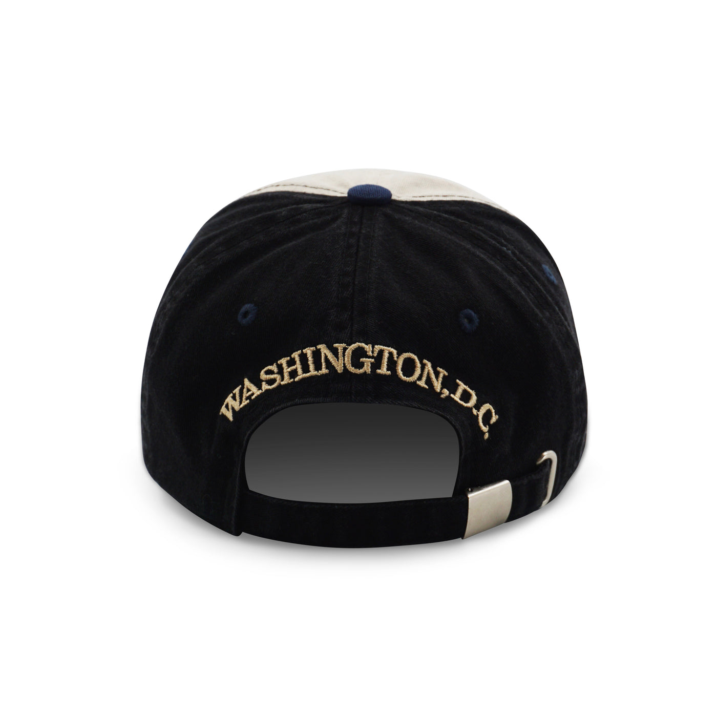 Showcase your love for the capital with our Two-Tone Baseball Cap featuring a vibrant Washington DC design in khaki, navy, and black. This stylish cap is perfect for any outing.