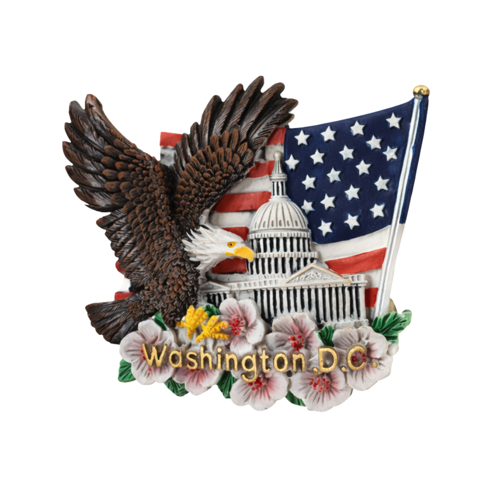 Design: This magnet features an American flag background with the U.S. Capitol centered and a bald eagle on the side. Cherry blossoms are displayed at the bottom, with "Washington D.C." written above them.